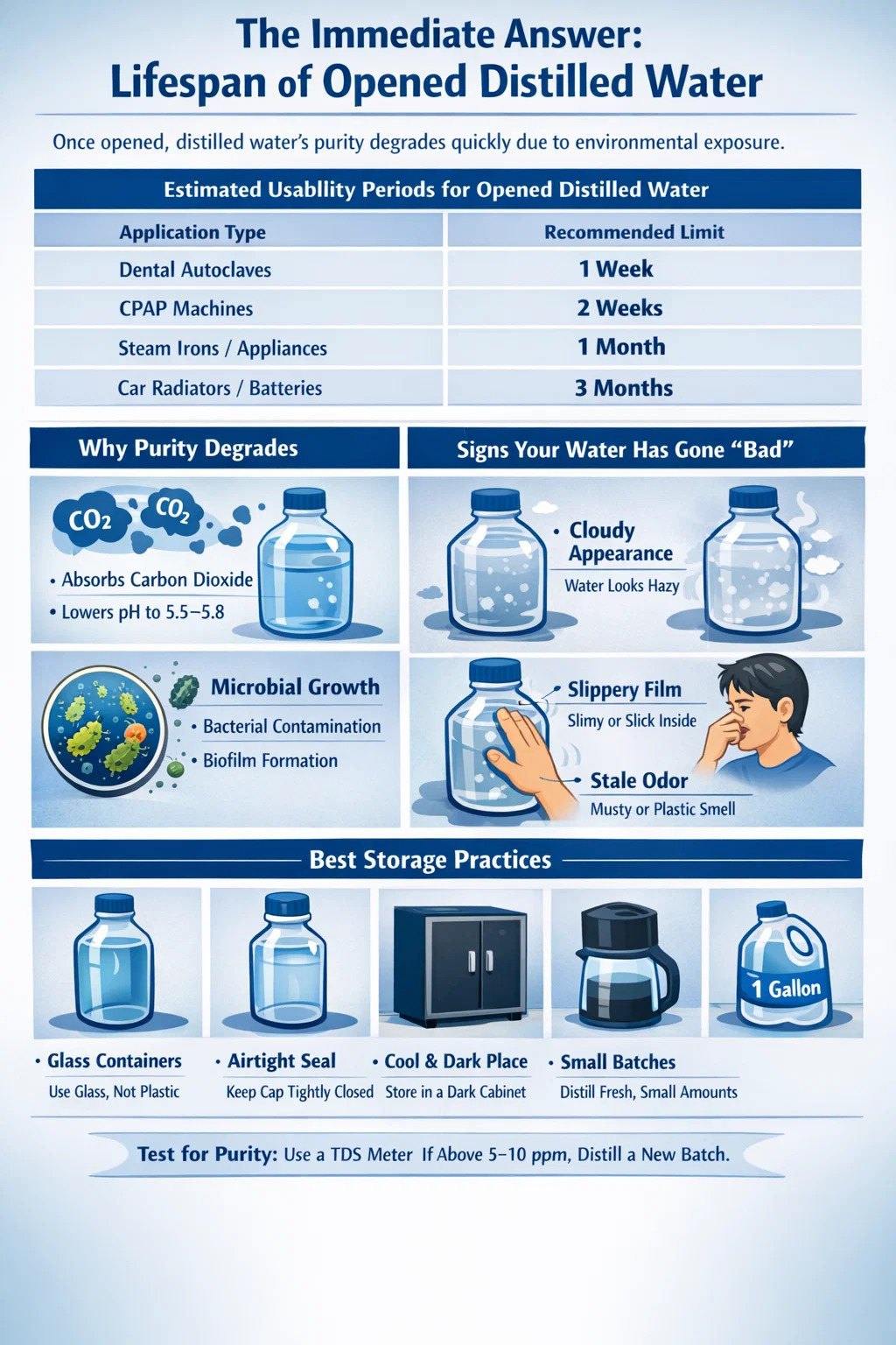 Po otwarciu butelki wody destylowanej jej stan wysokiej czystości zaczyna się pogarszać w wyniku narażenia na działanie środowiska. Do celów medycznych lub dentystycznych - takich jak użycie w autoklawie - na ogół wystarcza otwarta woda destylowana 7 do 14 dni jeśli jest prawidłowo przechowywany w chłodnym i ciemnym miejscu. W przypadku urządzeń gospodarstwa domowego, takich jak żelazka parowe lub nawilżacze, może pozostać użyteczny do 30 dni . Chociaż woda nie „psuje się” w taki sam sposób jak żywność, agresywnie pochłania dwutlenek węgla i cząstki stałe unoszące się w powietrzu, które mogą zmieniać jej poziom pH i wprowadzać mikroskopijne zanieczyszczenia, które niweczą korzyści płynące ze stosowania wody. destylator wody .