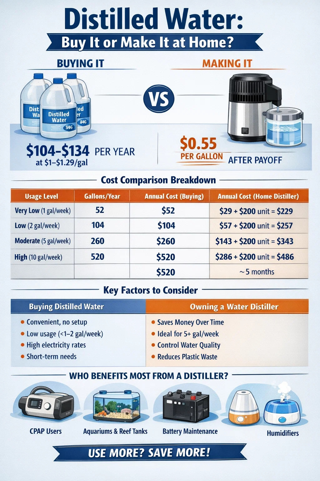 Użycie również szybko się skaluje. Maszyny CPAP zużywają średnio około 1 galona tygodniowo. Nawilżacz działający zimą może zużywać kolejne 1–2 galony tygodniowo. Akwarium słonowodne wymagające regularnego uzupełniania może wymagać 3–5 galonów tygodniowo. Akumulatory kwasowo-ołowiowe w zestawie solarnym lub w banku zasilania rezerwowego wymagają okresowej wody destylowanej. Połącz te zastosowania razem, a 5–10 galonów tygodniowo nie jest niczym niezwykłym, podnosząc roczne koszty zakupów w sklepie do 260–520 dolarów rocznie lub więcej.