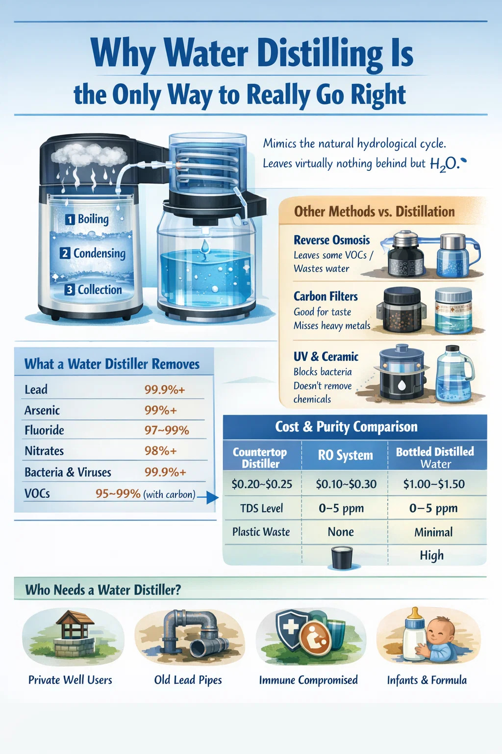 Jeśli poświęciłeś trochę czasu na badania nad oczyszczaniem wody, prawdopodobnie natknąłeś się na filtry odwróconej osmozy, bloki węgla aktywnego, sterylizatory UV i filtry ceramiczne. Wszyscy obiecują czystą wodę. Część z nich radzi sobie całkiem nieźle z usuwaniem określonych zanieczyszczeń. Ale żaden z nich nie jest nawet zbliżony do tego, co faktycznie robi destylator wody. Kiedy ludzie mówią, że destylacja wody to jedyny skuteczny sposób, nie dramatyzują. Opisują proces fizyczny, który naśladuje cykl hydrologiczny i nie pozostawia po sobie praktycznie niczego poza cząsteczkami H₂O.