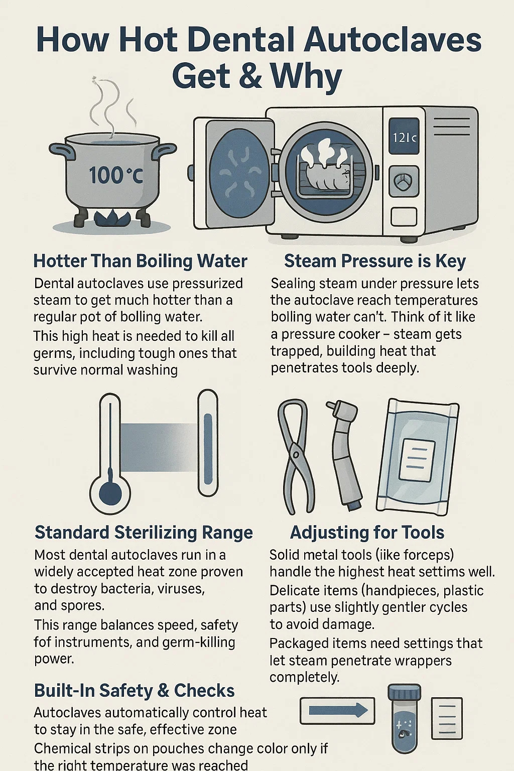 Autoklawy dentystyczne wykorzystują parę pod ciśnieniem, aby uzyskać znacznie wyższą temperaturę niż zwykły garnek z wrzącą wodą.