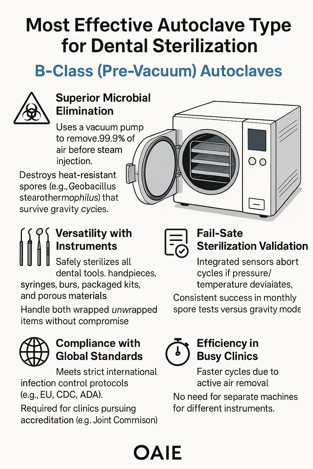Bezpiecznie sterylizuje wszystkie narzędzia dentystyczne: końcówki, strzykawki, wiertła, pakowane zestawy i materiały porowate.